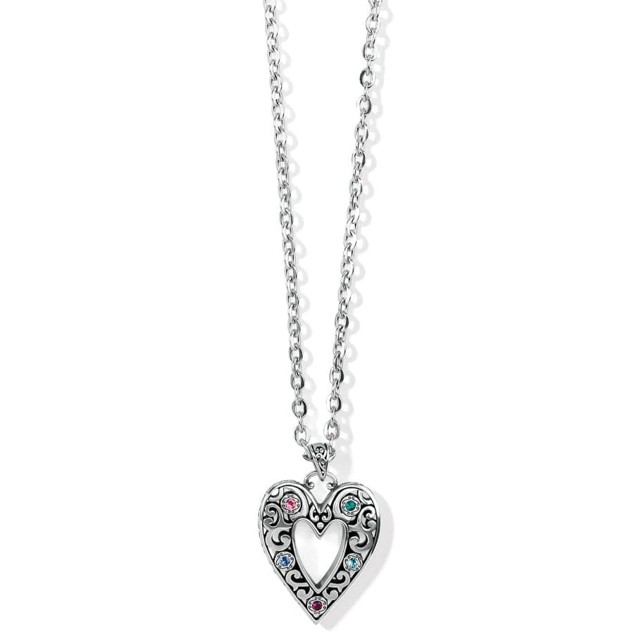 The radiant medley of fine hand-set crystals nestled amid the silver scrolls of this heart pendant necklace is inspired by stained glass windows.