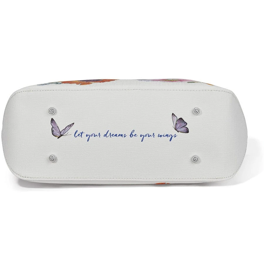 This beautiful tote features colorful custom butterfly artwork made up of floral butterfly wings that are breathtaking. On the bottom is the message, “Let your dreams be your wings.”