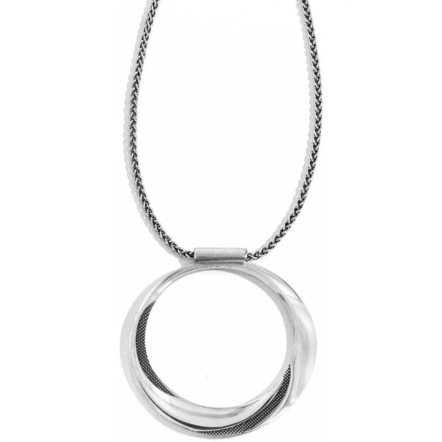 Look closely at the bottom of this circular pendant and you’ll see light-reflecting fine quality crystal “stars,” shining as if caught in moonlight. Completely reversible, with a sleek, simple design on its back.