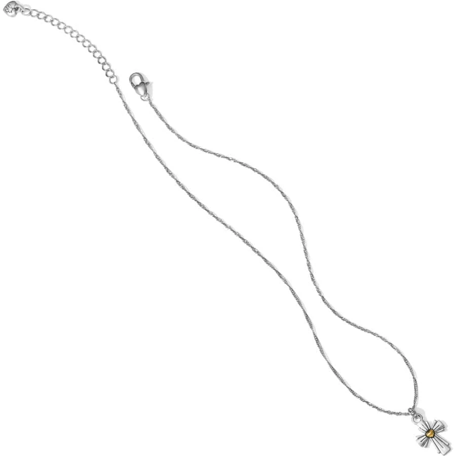 Surrounded by trees and foliage like a life-sized terrarium with glass-paned walls and ceiling, the Wayfarers Chapel in Southern California inspired this cross. It symbolizes radiating light and love.